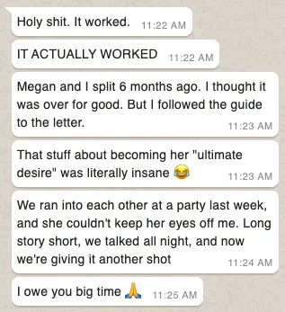 • The Obsession Formula: My step-by-step system to make her fantasize about reuniting with you (warning: use with caution)